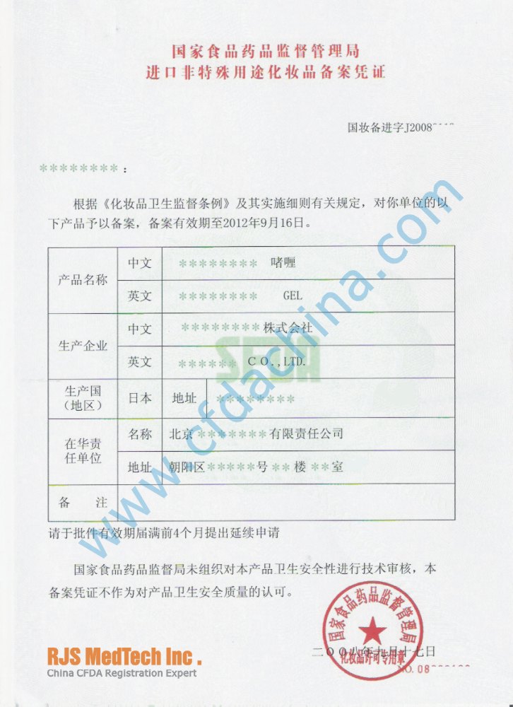 China import cosmetics registration license(CFDA approval certificate)